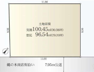 | 敷地面積 | 実測100.45㎡(30.38坪) 登記:96.54㎡(29.20坪) |